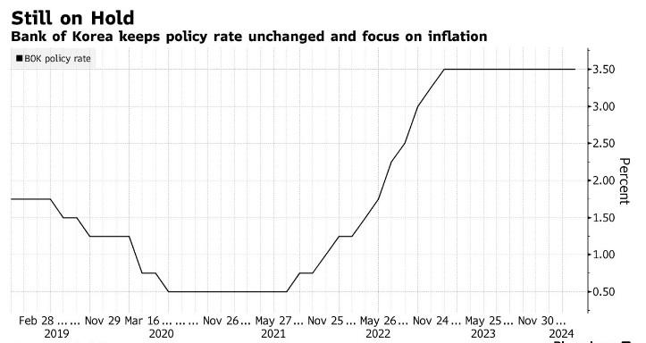 智通财经获悉,韩国央行周五维持基准利率不变,与预期一致,同时调整了指引,暗示不会在“长时期”内维持其限制性立场。韩国央行周五将7天期回购利率维持在3.5%不变,并表示将在“足够”的时间内维持这一利率水平。相比之下,韩国央行此前的措辞为“足够长的时间”内保持限制性政策。这表明韩国央行将暂时继续对抗通胀,但也为今年晚些时候的最终转向做准备。