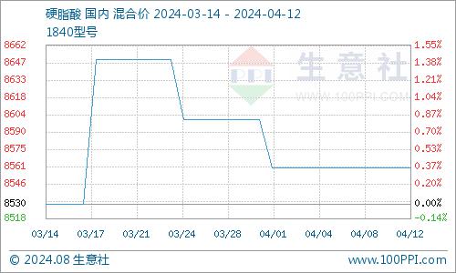 据生意社商品行情分析系统监测,经历了前面的起伏低宕本周硬脂酸市场归于平静,截至4月12日国内硬脂酸(1840)主流价格在8560元/吨,较3月1日上涨1.78%,较1月上涨4.14%。