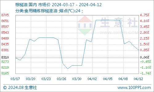 成本面:本周马来棕榈油产量预估增加,期价走低,外盘期货行情提振作用有限,连盘豆油棕榈油行情下探。截至今日棕榈油市场均价8660元/吨。4月中旬,南美大豆陆续上市,供应压力仍在,后市豆油棕榈油上涨乏力。