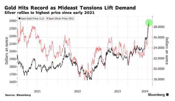 数据显示,COMEX黄金一度站上2400美元大关,而白银则创下2021年2月以来的最高水平。据知情人士透露,伊朗可能会在未来几天对以色列发动军事报复行动。