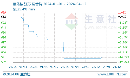 近日(4.1-4.12)氯化铵行情弱势盘整,据生意社商品行情分析系统显示,截至4月12日农业用氯化铵干铵华东地区价格在592元/吨,较月初持平。原料液氨价格继续大幅上涨,氯化铵成本面支撑延续;尿素价格弱势震荡,对氯化铵支撑偏弱;氯化铵供应面仍宽松为主,加之国内下游需求偏弱,氯化铵市场整体偏弱运行。截至4月12日国内农业用氯化铵干铵主流出厂价在500~600元/吨;湿铵主流出厂价在400~500元/吨附近。