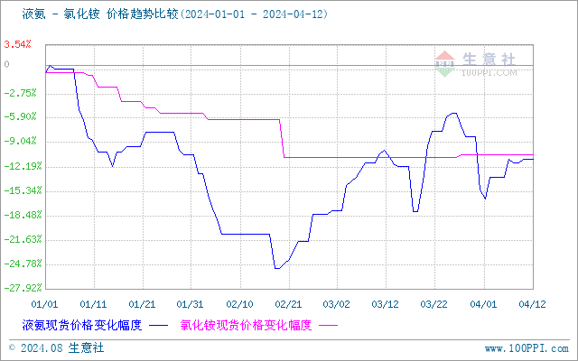 近日(4.1-4.12)液氨市场行情大幅上涨,氯化铵成本支撑走强。据生意社商品行情分析系统显示,截至4月12日液氨价格在3216元/吨,较1日的3073元/吨上涨了4.66%。
