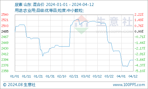 近日(4.1-4.12)尿素市场行情小幅走跌,对氯化铵影响偏空。据生意社商品行情分析系统显示,截至4月12日尿素价格在2394元/吨,较1日的2415元/吨小幅下跌0.86%。当前尿素市场供需错配,尿素日产量处18万吨高位,但农业基层方面偏弱运行,经销商随用随采,尿素价格弱势运行。