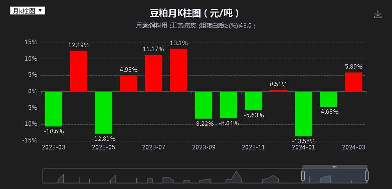 根据生意社豆粕月k柱图可以看出,2023年9月开始,豆粕就进入下行通道了,连跌三个月,12月豆粕上涨只有0.51%。2024年1-2月豆粕连跌,3月迎来反弹。4月1-12日,下跌5.68%。