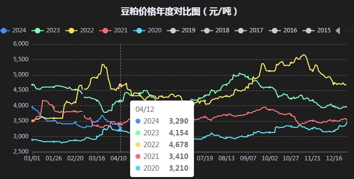 根据生意社豆粕价格年度对比图可以看出,2024年1-2月,豆粕行情持续下跌,跌幅超16%。3月开始迎来上涨行情,振荡上涨超半个月之后,豆粕行情继续下跌一直跌至4月中旬,4月14日豆粕价格处于2024年内最低点,跌至2020年同期水平。