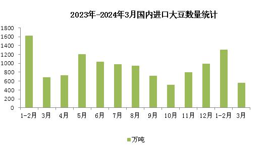 供应面:根据生意社进口大豆数据图可以看出,2024年1-2月进口大豆数量少于去年同期,3月进口大豆554.1万吨,1-3月,进口大豆累计达到1857.7万吨,同比减少10.8%。虽然一季度大豆数量与往年相比有所减少,但是从4月开始,进口大豆数量将明显增加,国家粮油中心预测数据,4-6月大豆月均到港量在1000万吨左右。随着进口大豆数量的回升,豆粕供应趋紧局面将陆续缓解,行情上涨乏力,弱势下跌为主。