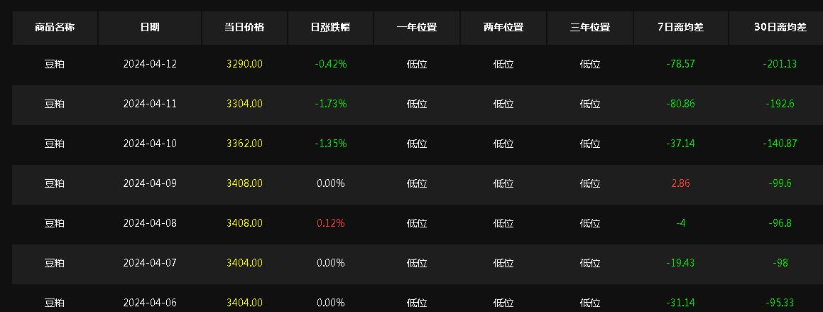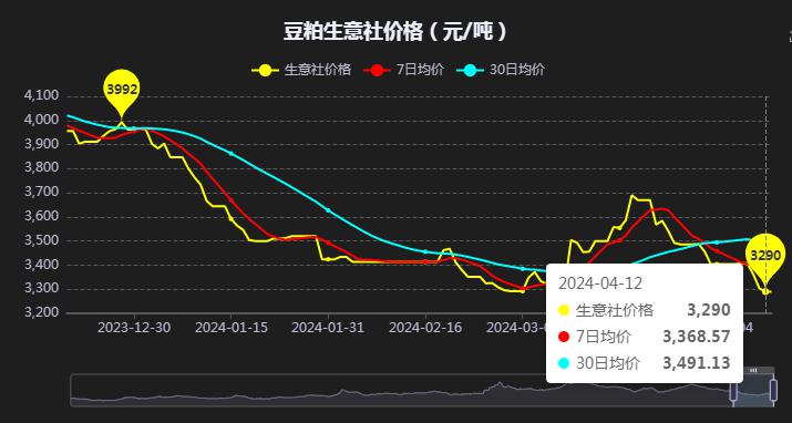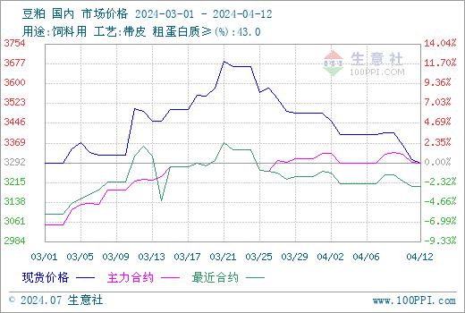 据生意社商品分析系统数据显示:4月开始,多重利空打压,国内豆粕行情跌跌不休,市场均价跌破3300元/吨。4月1日,豆粕市场均价3488元/吨,4月12日,豆粕市场均价3290元/吨,下跌5.68%。