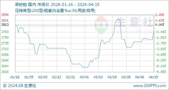 4月15日,生意社菜籽粕基准价为2751.67元/吨,与本月初(2720.00元/吨)相比,上涨了1.16%。