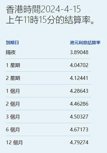 4月15日,港元短期拆息轻微回升,其中,隔夜息由近一个月低位反弹至3.89048%,与楼按相关的一个月拆息结束十连跌,今报4.28643%。