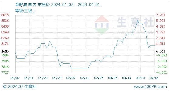 4月1日,生意社菜籽油基准价为8145.00元/吨,与上月初(7970.00元/吨)相比,上涨了2.20%。