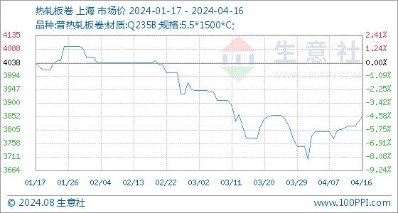 4月16日,生意社热轧板卷基准价为3834.00元/吨,与本月初(3748.00元/吨)相比,上涨了2.29%。