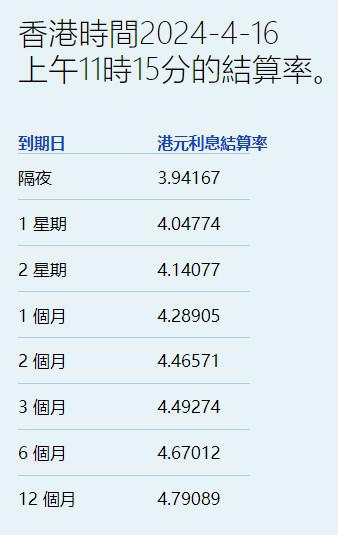4月15日,隔夜息报3.94167%,见逾一周新高,与楼按相关的一个月拆息亦连升两天,至4.28905%。