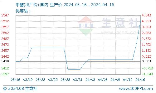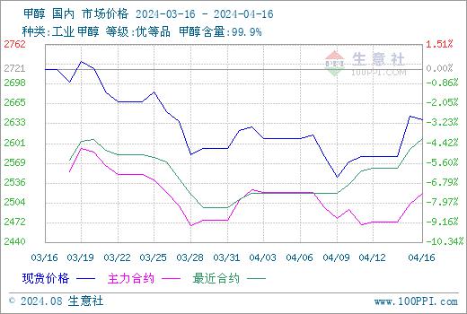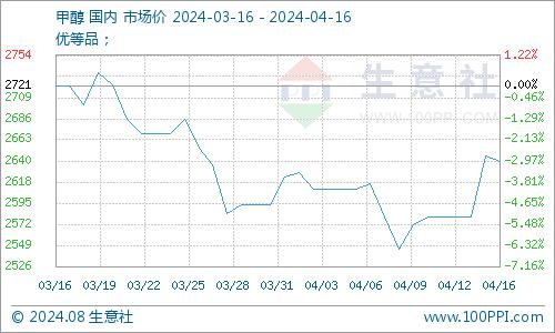 据生意社商品行情分析系统,4月9日至16日(截止15:00),国内甲醇市场华东港口均价自2545元/吨上涨至2640元/吨。周期内价格涨幅3.70%,环比下跌3.00%,同比上涨6.81%。近期甲醇基本面矛盾不大,目前国内甲醇装置开工仍处高位,且下游对高价存一定抵触心理,但内地样本企业库存偏低位,企业出货压力不大,加之部分企业外采,整体市场气氛尚可。