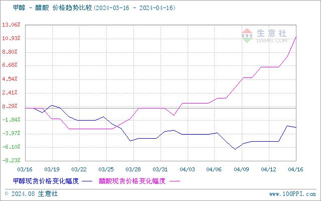 生意社甲醇-醋酸(下游产品)价格走势比较图: