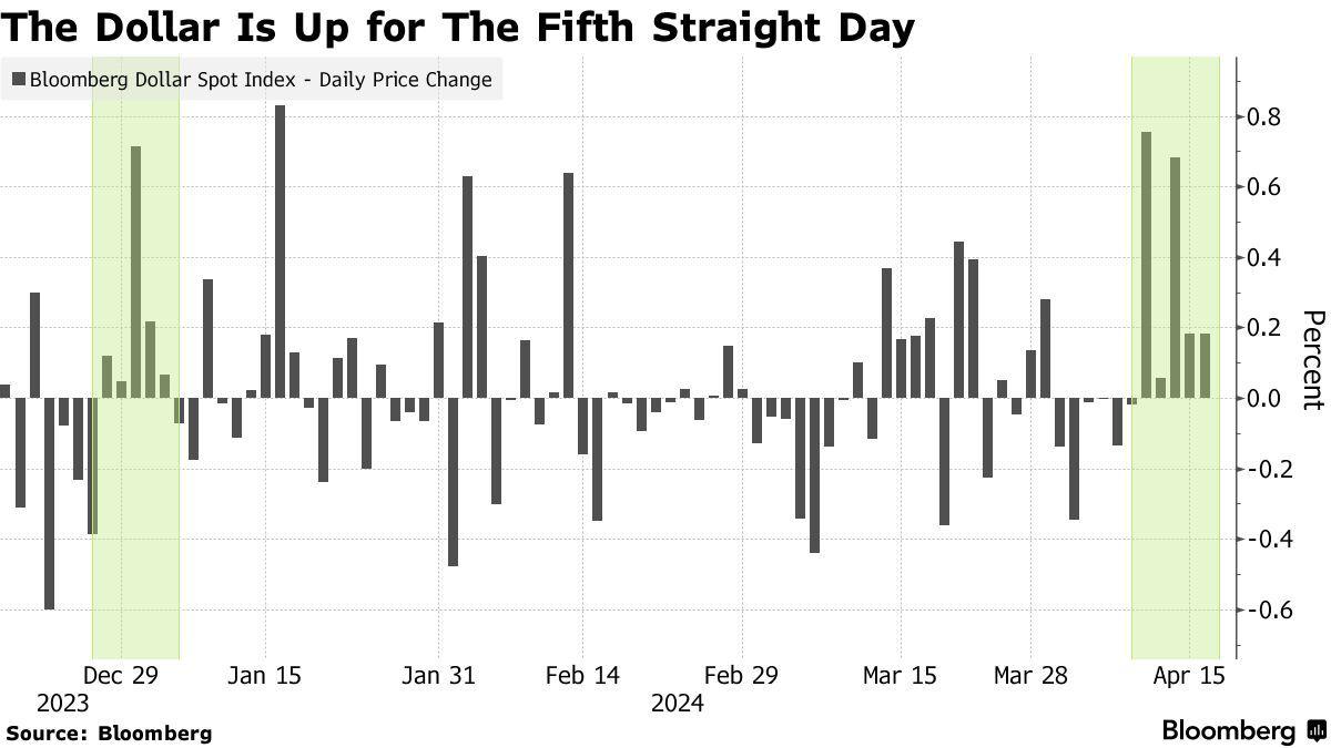对美国利率将在更长时间内保持在高位的预期日益增强促使投资者大举买入美元,美元有望创下一年多来的最大单周涨幅。周二,Bloomberg美元指数连续第五个交易日走高,至去年11月以来的最高水平。