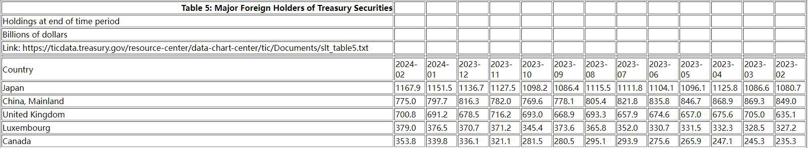 根据美国财政部17日公布国际资本流动报告(TIC)显示,2月中国大陆持有美债7750亿美元,环比减少227亿美元,持仓在连增两个月后连降两月,总持仓开始接近去年10月连续五个月所创的2009年以来十四年“低谷”。此外,作为现在最大的美国国债持有国,截至2月,日本持有美国国债1.1679万亿美元,较1月环比增加164亿美元,总持仓连续第三个月创2022年8月美元以来新高。至此,日本的持仓连续五个月、最近九个月内第八个月增加。