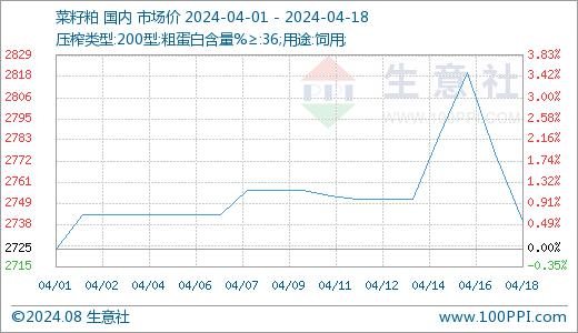 据生意社商品行情分析系统监测,4月12日菜粕市场均价为2751元/吨,4月18日菜粕市场均价为2740元/吨,期间下跌幅度在0.42%。