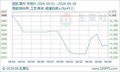 豆粕方面:据生意社商品行情分析系统监测,4月1日豆粕市场均价为3488元/吨,4月18日豆粕市场均价为3334元/吨,期间下跌幅度在4.42%。4月豆粕整体震荡偏弱下滑为主,菜粕行情受到拖累。