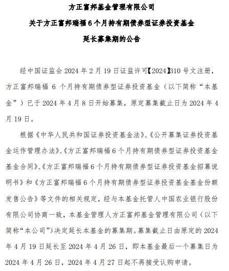 中国经济网北京4月18日讯今日,方正富邦基金管理有限公司发布关于方正富邦瑞福6个月持有期债券型证券投资基金延长募集期的公告,募集截止日由原定的2024年4月19日延长至2024年4月26日,2024年4月27日起不再接受认购申请。