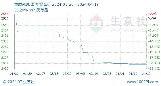 4月19日,生意社重质纯碱基准价为2080.00元/吨,与本月初(2090.00元/吨)相比,下降了-0.48%。