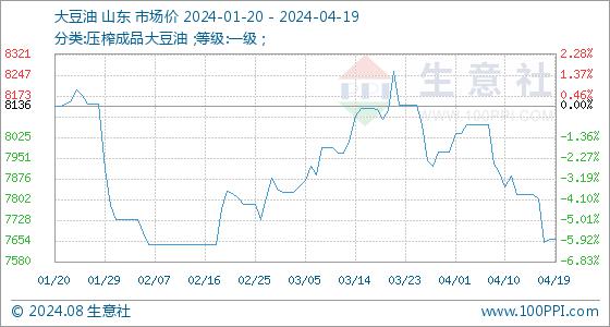 4月19日,生意社大豆油基准价为7662.00元/吨,与本月初(7972.00元/吨)相比,下降了-3.89%。