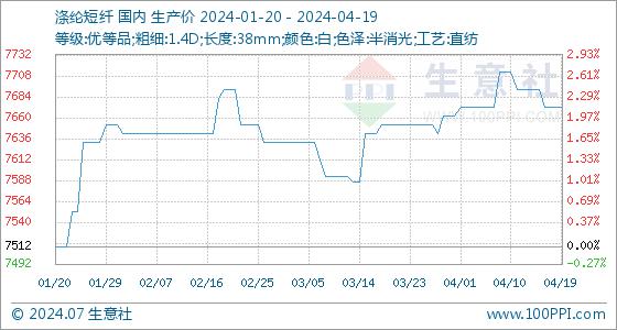 4月19日,生意社涤纶短纤基准价为7672.00元/吨,与本月初(7662.00元/吨)相比,上涨了0.13%。