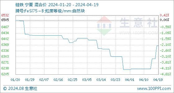 4月19日,生意社硅铁基准价为6364.29元/吨,与本月初(6232.86元/吨)相比,上涨了2.11%。