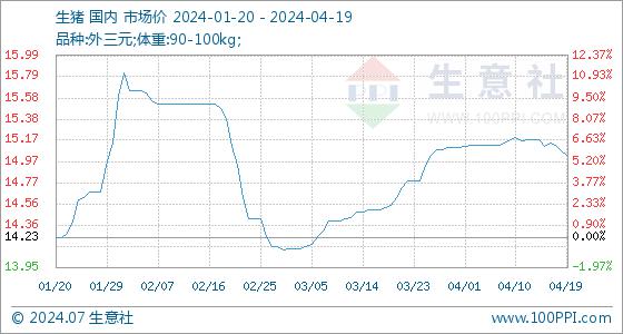 4月19日,生意社生猪基准价为15.07元/公斤,与本月初(15.10元/公斤)相比,下降了-0.20%。