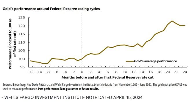 富国银行投资研究所分析师在4月15日的一份报告中表示,如果美联储对美国通胀持续降至2%的年度目标有信心,它可能会在今年晚些时候降息,这已经“不是什么秘密”。但“不那么为人所知的是,过去一些黄金最强劲的表现是在美联储降息周期期间出现的”。