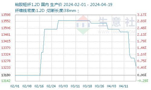 据生意社商品行情分析系统显示,本周(2024年4月15—19日),粘胶短纤价格弱势延续整理下滑。截止3月19日,1.2D*38mm粘胶短纤国内地区出厂报价为13240元/吨,较上上周价格下跌80元/吨,周跌幅0.60%。
