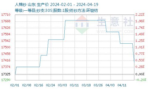 本周(2024年4月15—19日),下游人棉纱弱势整理,市场执行订单为主,整体价格小幅下行,部分纱厂报价局部价格出现走弱,整体出货一般,库存基本维持,需求端表现疲软,下游需求暂无明显转好,场内实单成交有限。截止4月19日人棉纱(30S,环锭纺,一等品)出厂均价为17400元/吨,较上周下跌125元/吨,周跌幅0.71%。