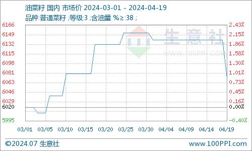 据生意社商品行情分析系统监测,本周国产菜籽价格价格下滑,4月15日国产菜籽市场均价为6140元/吨,4月19日国产菜籽市场均价为6072元/吨,期间报价下跌1.11。国产陈菜籽余量不多,贸易商进入清仓工作。加之下游需求处于淡季,市场走货欠佳,贸易商降价销售。目前新菜籽涨势良好,新菜籽预计五一前后陆续上市。下游需求处于淡季,贸易商降价销售意愿较强,预计国产菜籽小幅下滑之后,持稳为主。