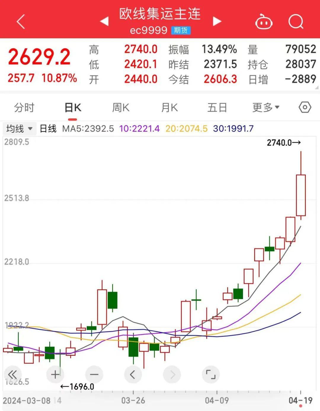 值得注意的是,近期集运盘面重心持续上移。究其原因,方正中期期货海运及商品指数总监陈臻表示,随着中东局势升级,短期内市场看不到红海危机和解的曙光,班轮无法复航苏伊士运河,红海绕行将会常态化,原先被低估的远月合约从而出现补涨。同时,多家头部班轮公司提涨5月1日FAK报价,双重因素促使EC期货盘面中枢上移。