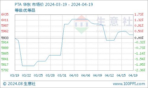 据生意社商品行情分析系统,本周(4月15-19日)国内PTA现货市场行情呈现先涨后跌态势,截止4月19日华东地区市场均价在5948元/吨,较周初下跌0.18%。