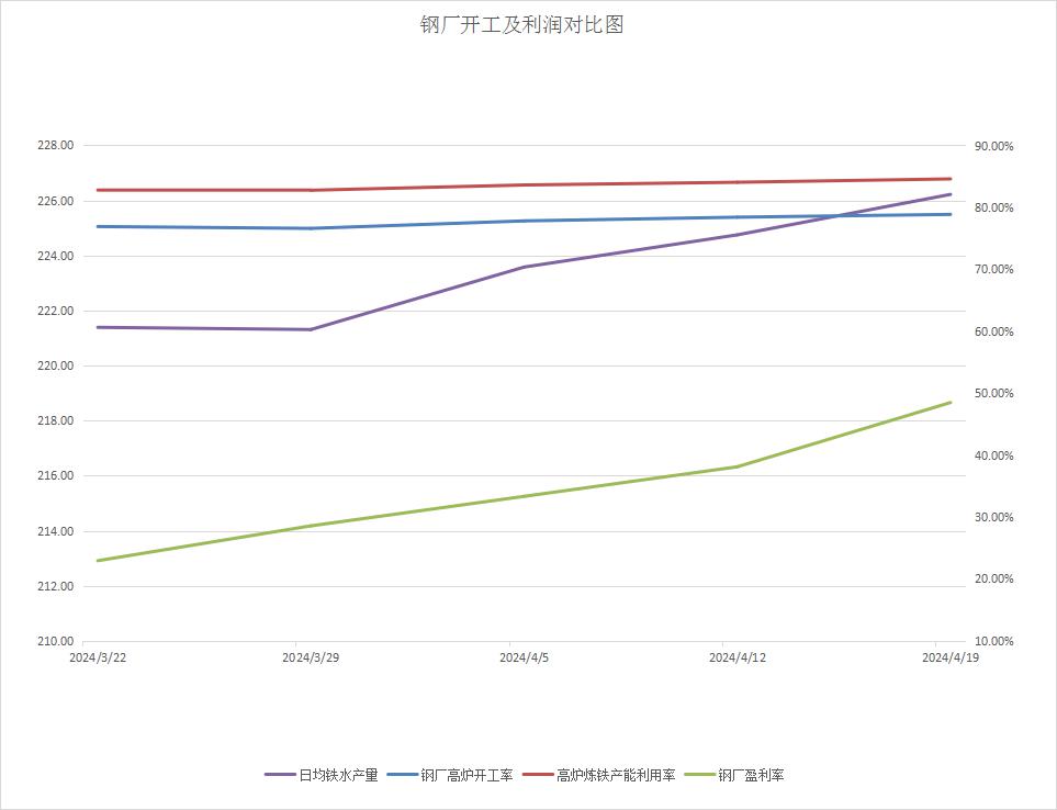 需求方面,截至4月19日,钢厂高炉开工率78.86%,周环比上升0.45%;高炉炼铁产能利用率84.59%,环比上升0.54%;钢厂盈利率48.48%,环比增加10.38%;日均铁水产量226.22万吨,环比增加1.47万吨;当前样本钢厂的进口矿日耗为276.6万吨,环比增加0.89万吨。本周钢厂开工积极好转、铁水产量增长。4月以来下游钢材成交量向好运行,而前期大跌的矿价降低钢厂生产成本,也让钢厂因为利润情况开始恢复,叠加高炉检修结束,钢厂短期补库提货操作增多特别是钢厂生产成本下降后,后续开工持续进行,钢厂厂内铁矿石库存量逐渐减少,钢厂采购操作会有所增加,但要看钢厂利润情况以及下游钢材成交情况,不过下周是五一节前最后一周,大概率会有节前补库操作出现,预计下周铁矿需求有集中释放可能。
