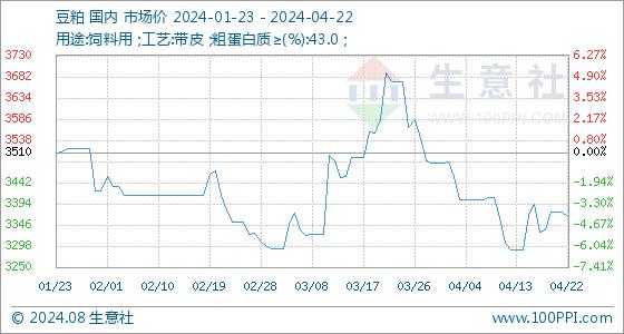 4月22日,生意社豆粕基准价为3376.00元/吨,与本月初(3486.00元/吨)相比,下降了-3.16%。