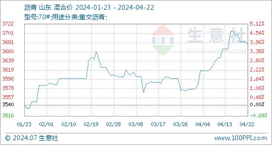 4月22日,生意社沥青基准价为3682.29元/吨,与本月初(3576.57元/吨)相比,上涨了2.96%。