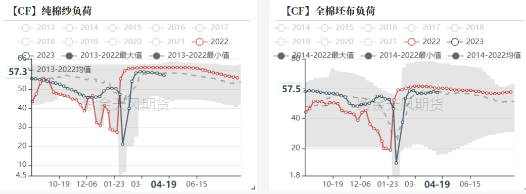 截至4月19日,棉纱厂开机负荷为57.3%,小型纺企减停产持续增加,开机率继续小幅下滑。棉布开机为57.5%,开机出现下滑。