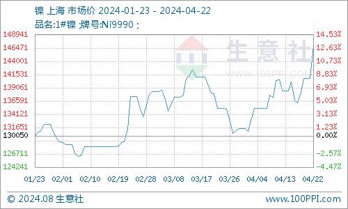 据生意社镍价格监测,22日,镍现货市场均价146883.33元/吨,较上一交易日上涨4.33%。