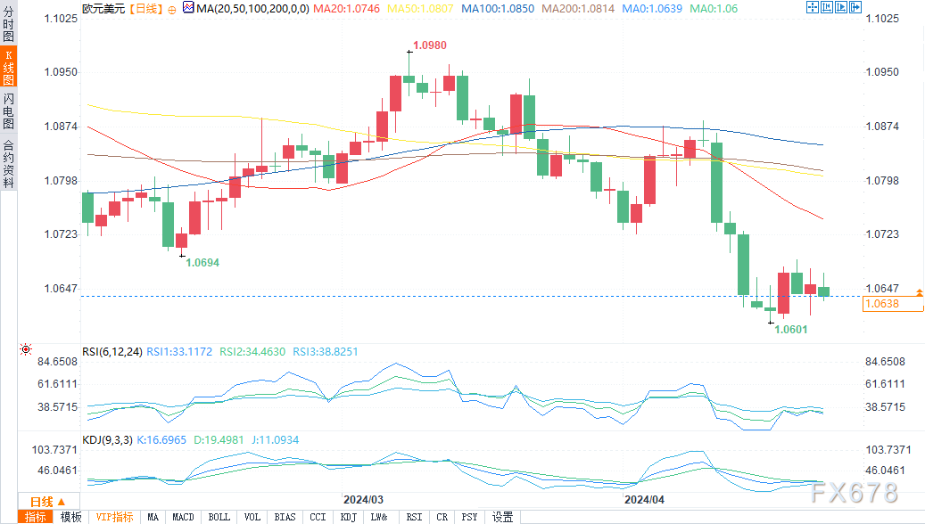 汇通财经APP讯——周一(4月22日)欧盘时段,欧元/美元跌势加剧,盘中报1.0638,跌幅0.17%。