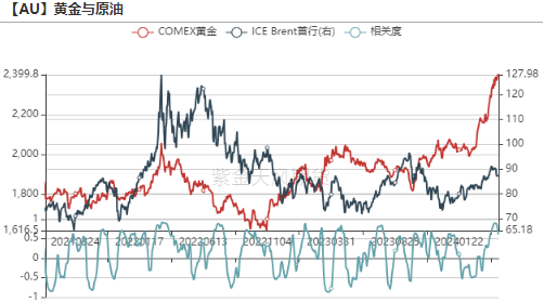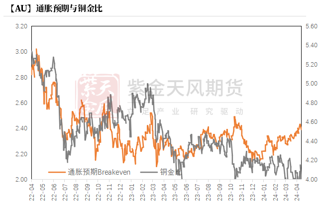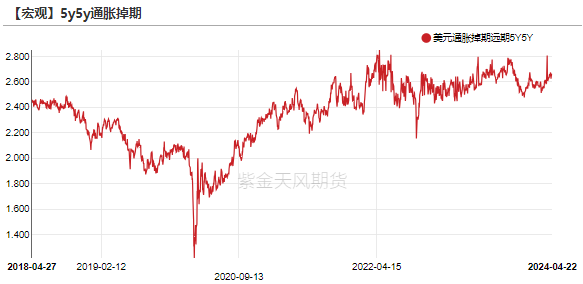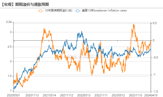 上周伦敦金现货价格进一步上涨2.07%至$2391.7/oz,继续无视美债收益率的上升与美元指数的上行,对美联储主席鲍威尔鹰派态度也反应寥寥。即使周一(4.22)因中东地缘政治局势有所缓解而回落,由通胀预期抬升带来的这一轮上涨势头也并非彻底转向。考虑到市场已经price-in了本周五将要小幅上升的PCE指数,我们认为名义黄金价格的上行仍具有一定空间。