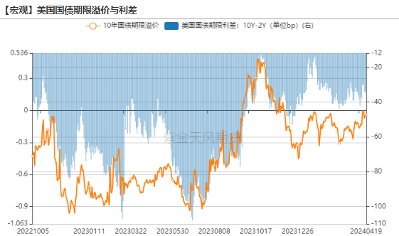 上周2yr UST上行9.4bps至4.988%,10yr UST上行10.7bps至4.624%,期限溢价小幅收敛至-3.9bps,收益率曲线趋陡。长端国债期限溢价自3月底以来小幅上移,拆解指标得知,一方面是长端通胀预期在上行,另一方面,鲍威尔在3月FOMC的意外偏鸽与其他众多联储官员意见相左,导致与货币政策分歧相关的MOVE index剧烈上移,上周二鲍威尔转向后该指数才有所下降。