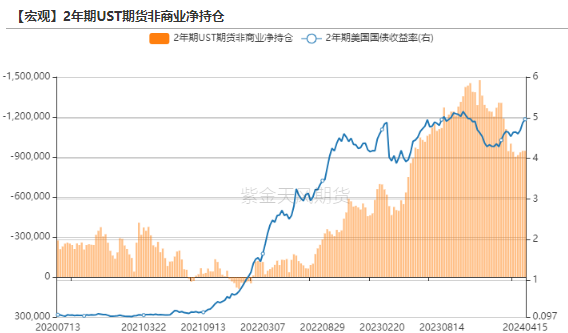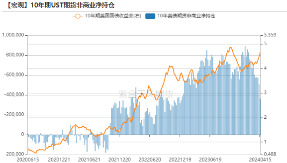 截止4.16的数据,美债利率持仓分化,2年期UST期货非商业净持仓空头增加13手至946303手;10年期UST期货非商业净持仓空头减少144846手至362039手。