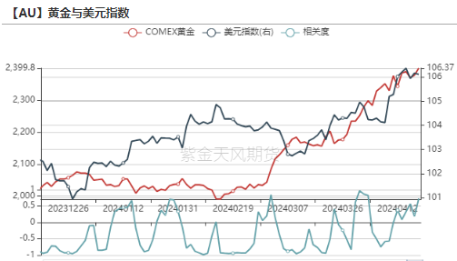 上周美元指数与黄金价格同向变动,黄金上涨2.07%,美元指数上涨0.09%,两者滚动相关性走高。