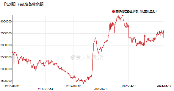 上周三美联储准备金余额降至3.3万亿美元,较前一周小幅降低。