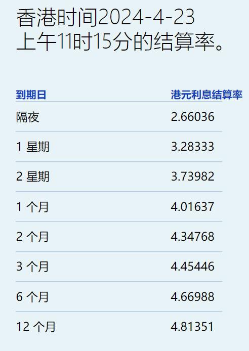 4月23日,港元拆息全线下跌,其中,隔夜息再跌近16基点至2.66036%,为去年8月31日以来最低。与楼按相关的一个月拆息连跌五天,今报4.01637%,险守4%水平,续创逾七个半月新低。一周拆息今日跌近22基点至3.28333%,反映银行资金成本的三个月拆息回落至4.45446%。六个月及一年期拆息再度下跌。