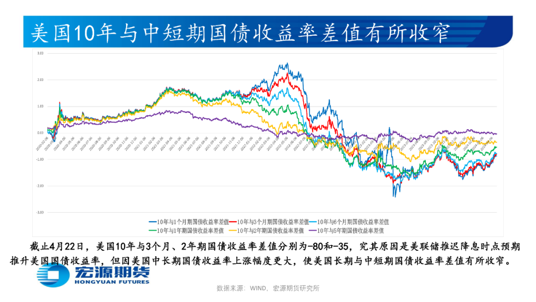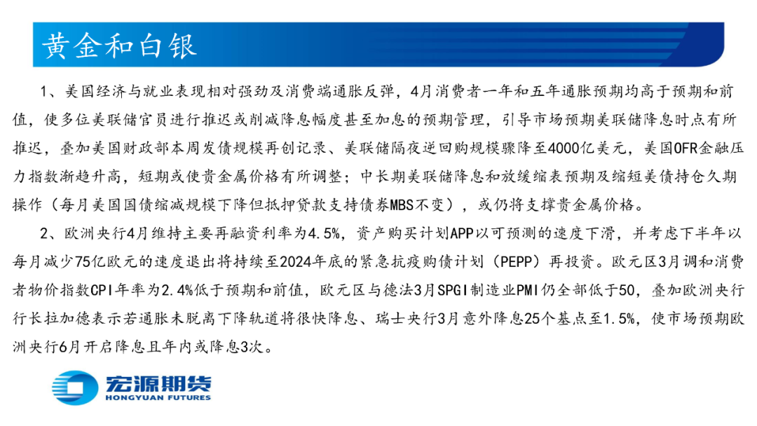 1、美国经济与就业表现相对强劲及消费端通胀反弹,4月消费者一年和五年通胀预期均高于预期和前值,使多位美联储官员进行推迟或削减降息幅度甚至加息的预期管理,引导市场预期美联储降息时点有所推迟,叠加美国财政部本周发债规模再创记录、美联储隔夜逆回购规模骤降至4000亿美元,美国OFR金融压力指数渐趋升高,短期或使贵金属价格有所调整;中长期美联储降息和放缓缩表预期及缩短美债持仓久期操作(每月美国国债缩减规模下降但抵押贷款支持债券MBS不变),或仍将支撑贵金属价格。
