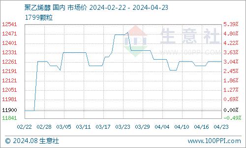 本周,国内聚乙烯醇价格稳中上行。截至目前,4月23日,生意社聚乙烯醇基准价为12266.67元/吨,与上周(12233.00元/吨)相比,上涨了0.27%。周内,聚乙烯醇市场刚需成交为主,出口面支撑一般,经销商多让利出货,中下游商家谨慎心态仍存。