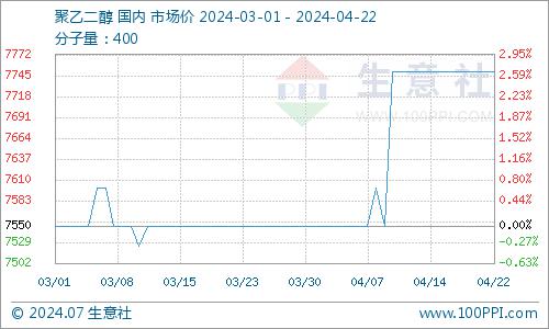 近期聚乙二醇市场稳定运行。据生意社商品行情分析系统,截止到4月23日聚乙二醇400企业报价均价为7750.00元/吨,较上周二价格相比,基本持平。