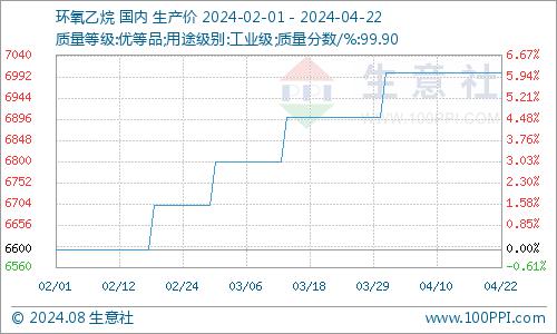 上游环氧乙烷:据生意社商品行情分析系统显示,4月22日,环氧乙烷参考价为7000.00,与4月1日持平,成本面向下传导不畅,环氧乙烷价格平稳运行,对聚乙二醇市场支撑稳健。